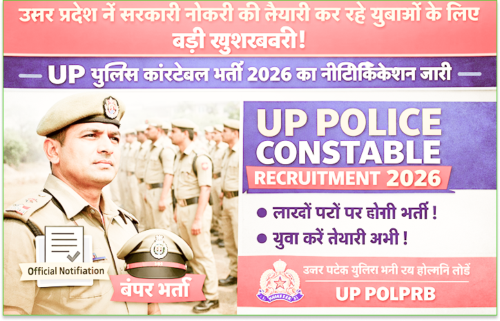 उत्तर प्रदेश में सरकारी नौकरी की तैयारी कर रहे युवाओं के लिए एक बहुत बड़ी खुशखबरी सामने आई है। उत्तर प्रदेश पुलिस भर्ती एवं प्रोन्नति बोर्ड (UPPRPB) ने UP Police Constable Recruitment 2026 के लिए आधिकारिक अधिसूचना जारी कर दी है। इस भर्ती के माध्यम से कुल 32,679 पदों पर सिपाही (Constable) की नियुक्ति की जाएगी।